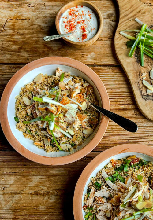 Allow the chicken to rest for a couple of minutes before shredding with two forks. Toss the shredded chicken through the couscous along with the spring onions and flaked almonds. Serve drizzled with the yoghurt.