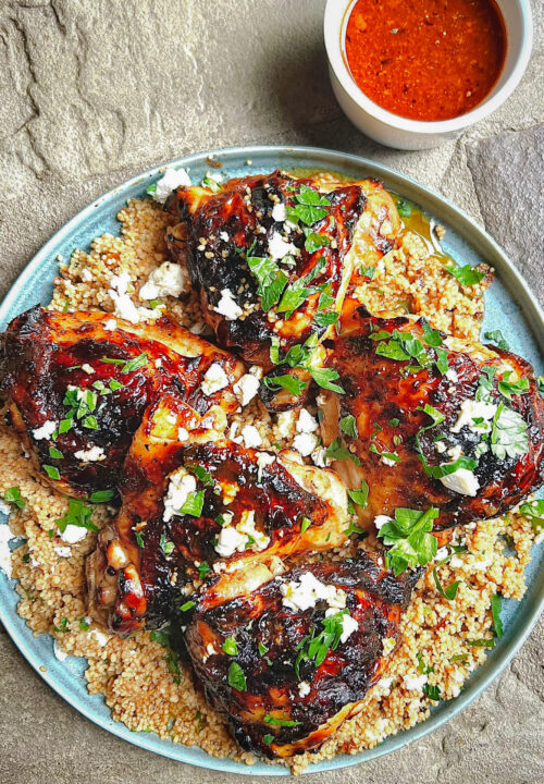 Zesty Hot-Honey Chicken Thighs with Couscous & Feta