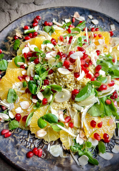 Winter Veg Couscous Salad with Candied Walnuts & Pomegranate