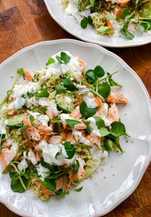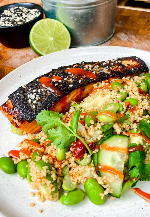 Zesty Seared Sriracha Salmon & Edamame Couscous Salad