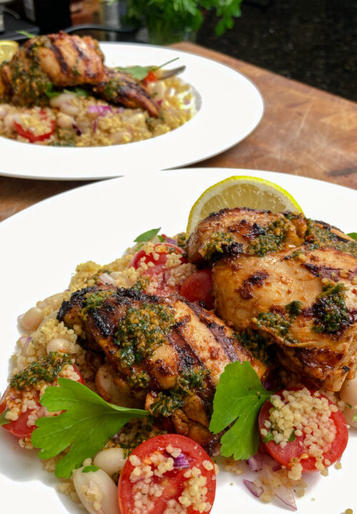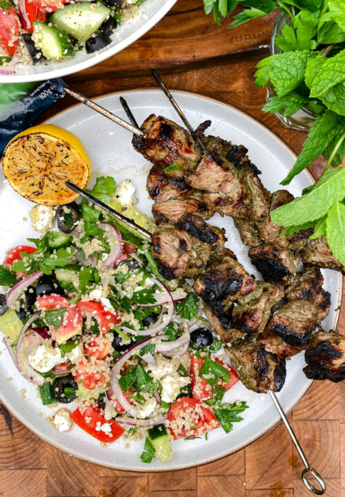 Barbecued Chicken Shawarma Kebabs with Tabbouleh Couscous