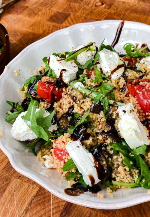 Toss the aubergine and tomatoes with the couscous. Just before serving toss through the salad leaves. Crumble over the goat’s cheese and drizzle with a little oil and some balsamic glaze.